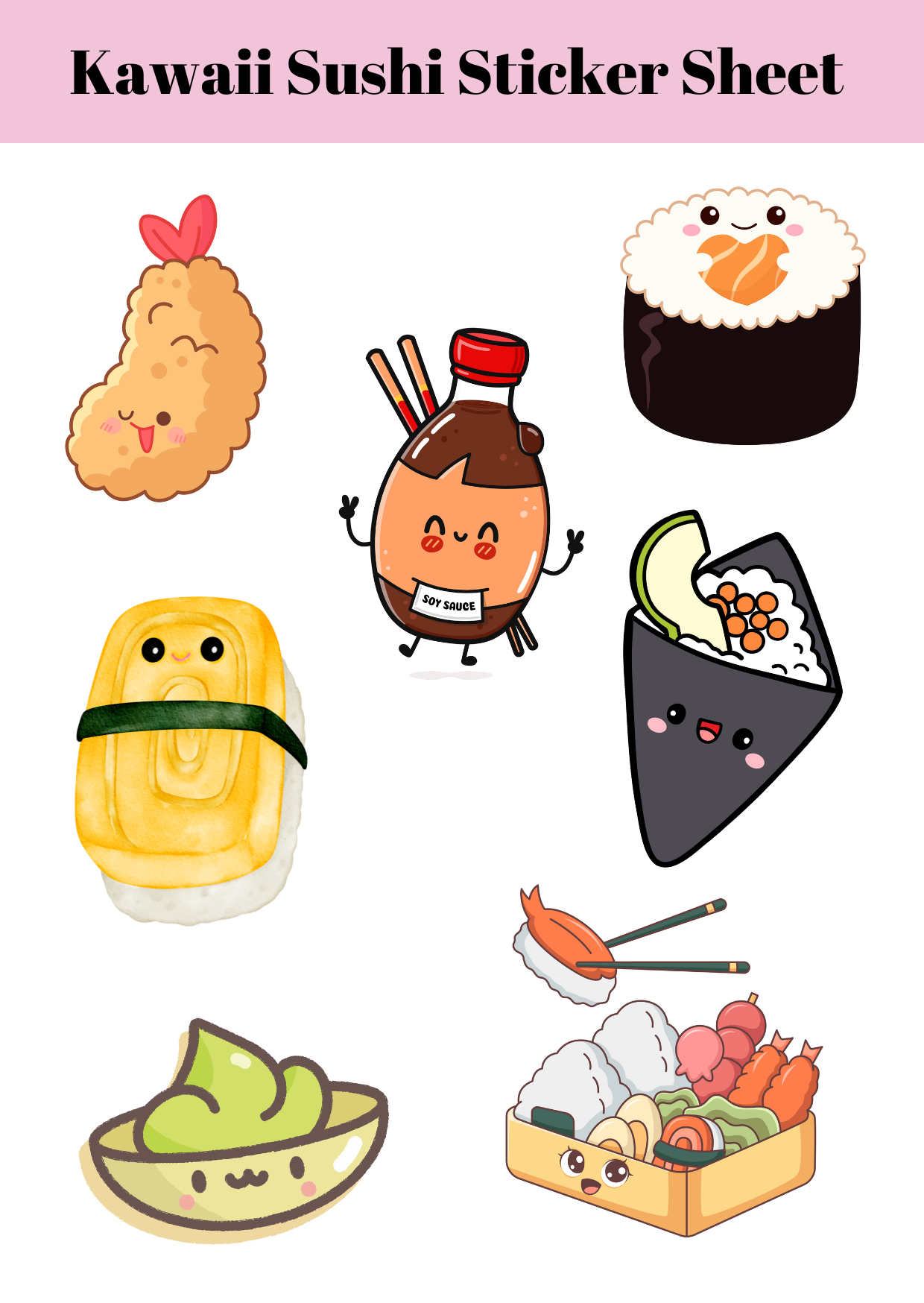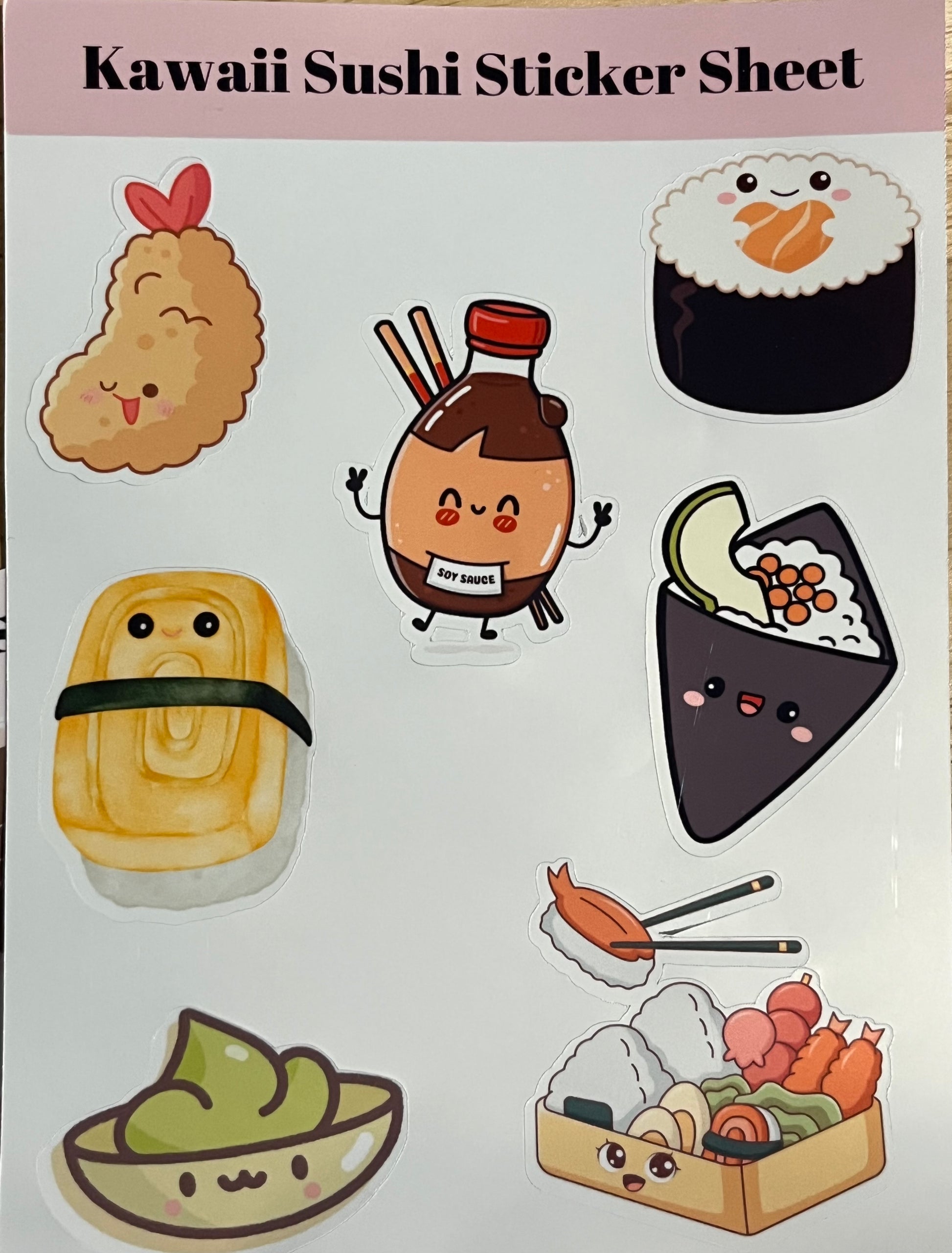 Kawaii Sushi Sticker Sheet is printed on high-quality glossy weatherproof matte sticker paper.