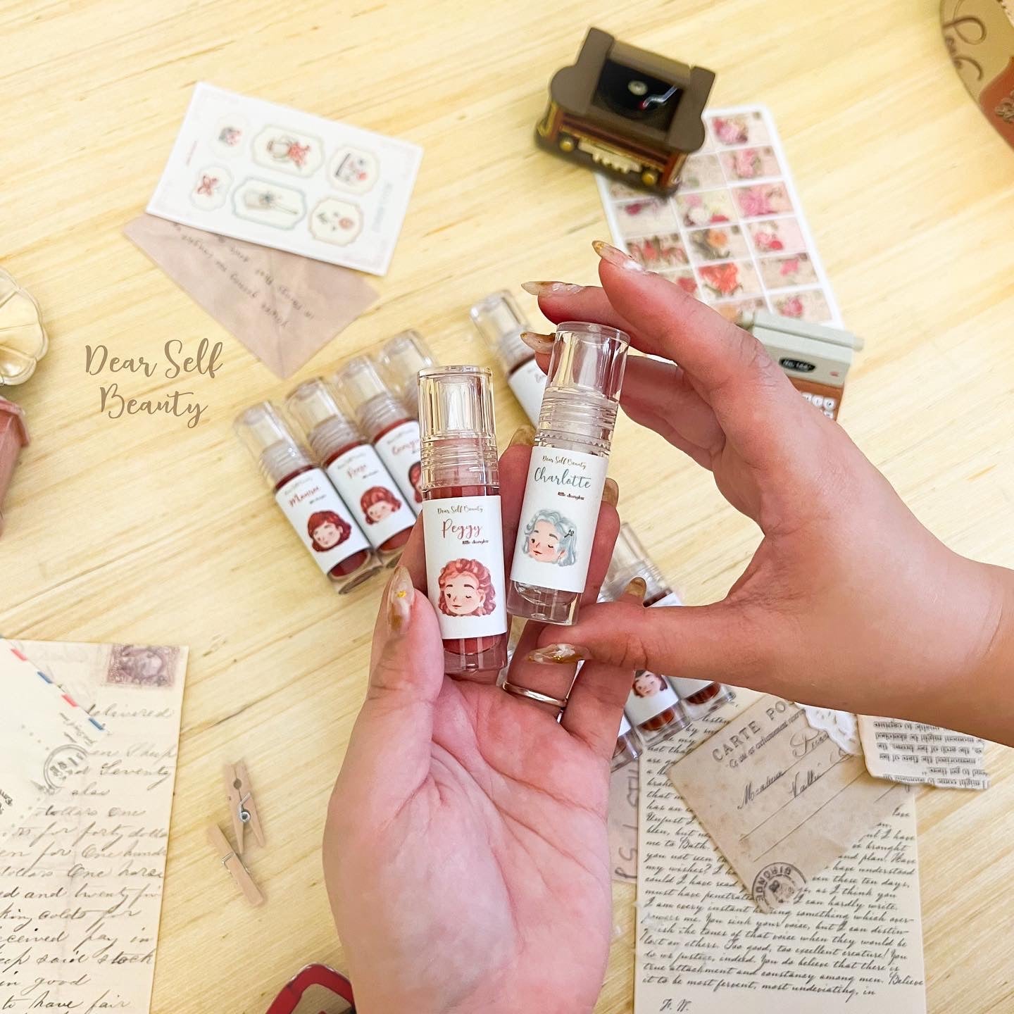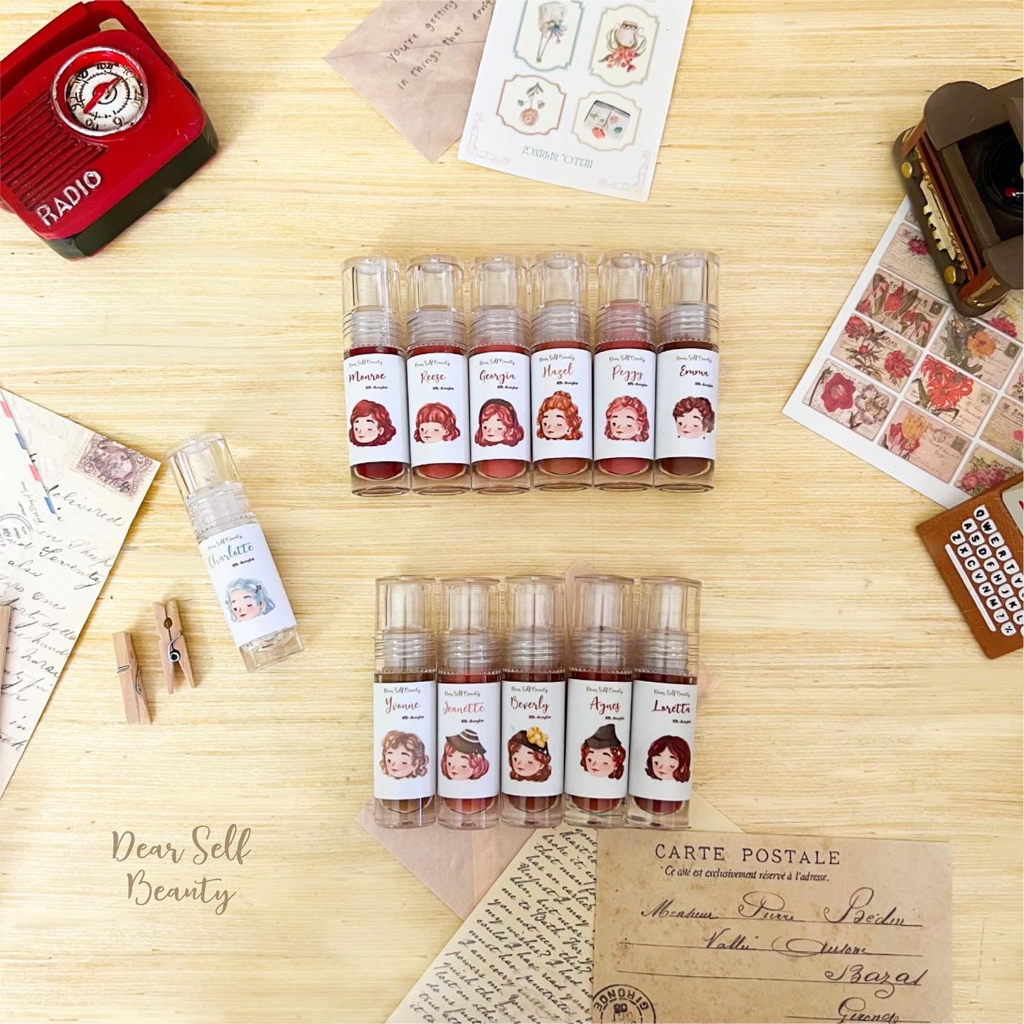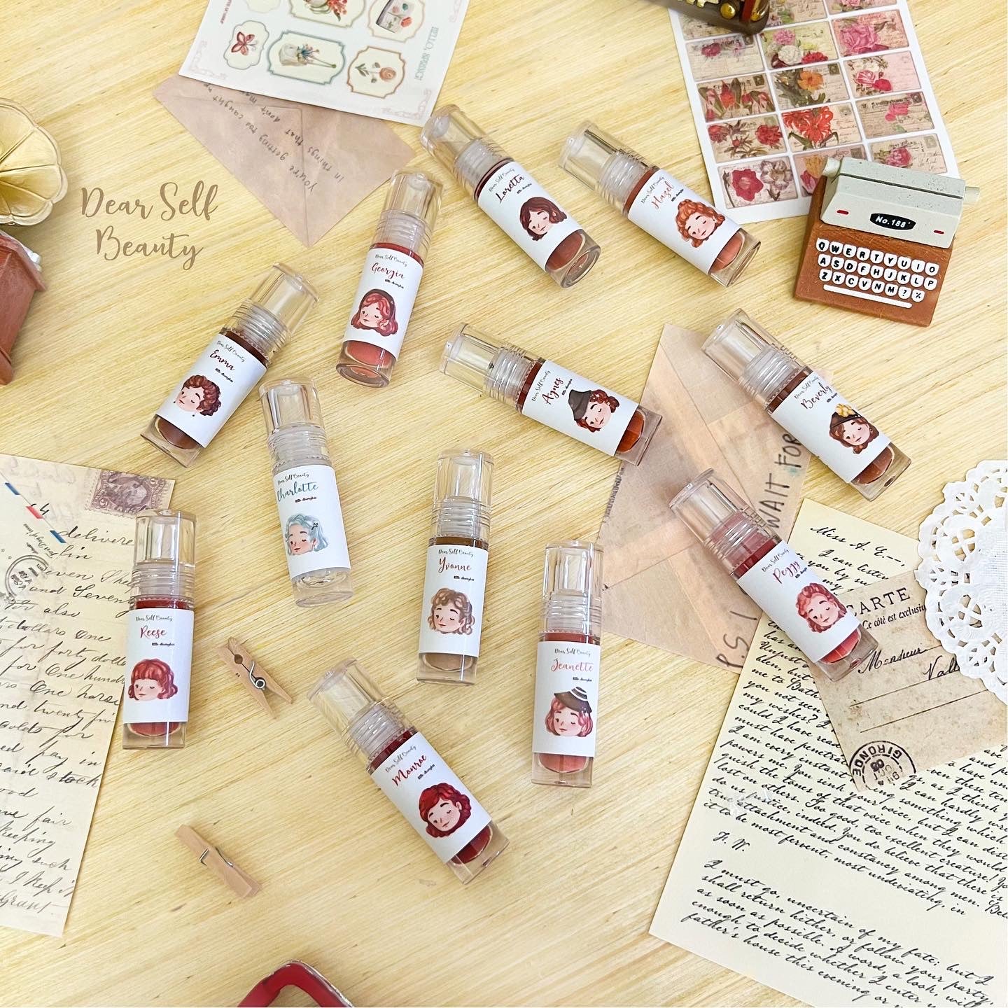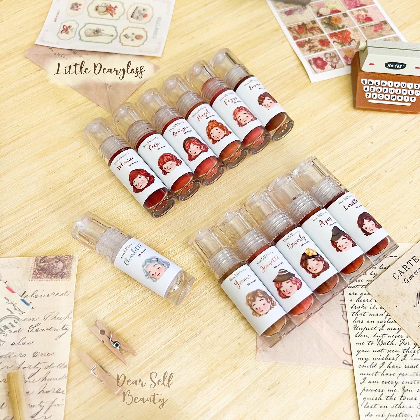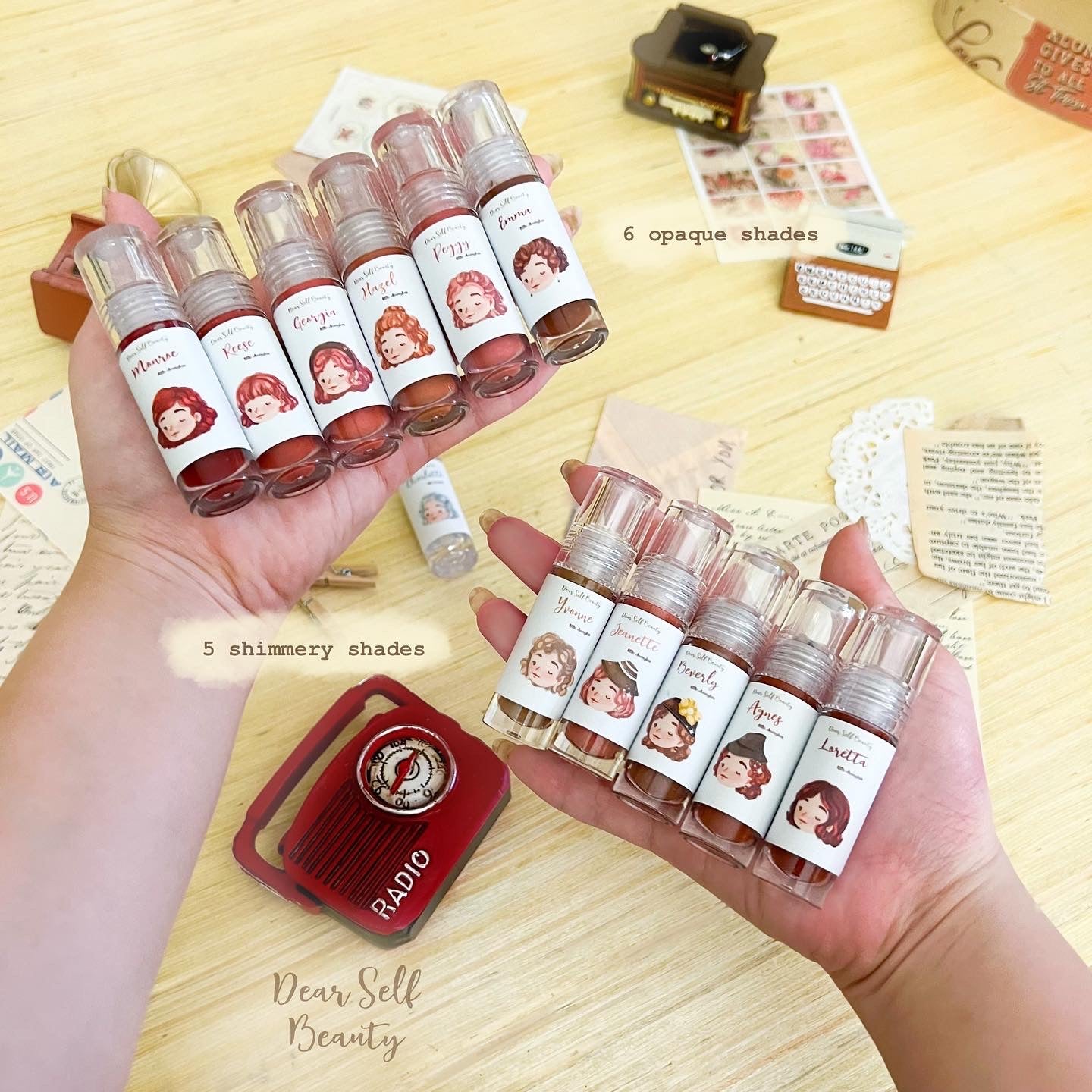 Each shade has a unique design of fashion from the old times. ✨ With 6 opaque shades, 5 shimmery shades & 1 clear shade to choose from (total of 12 shades!). Bold, sweet, charming— you can be anything you want with Deargloss. ☺️🤎