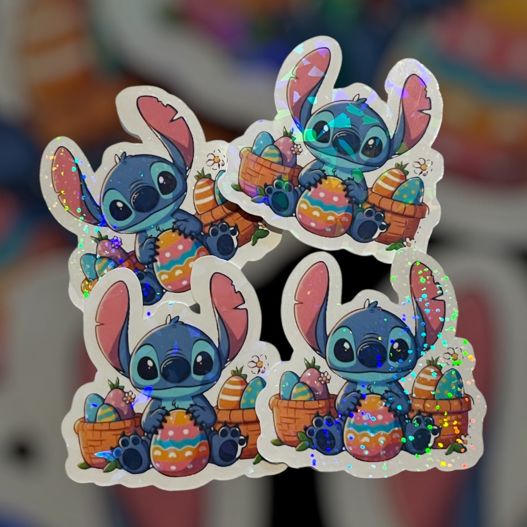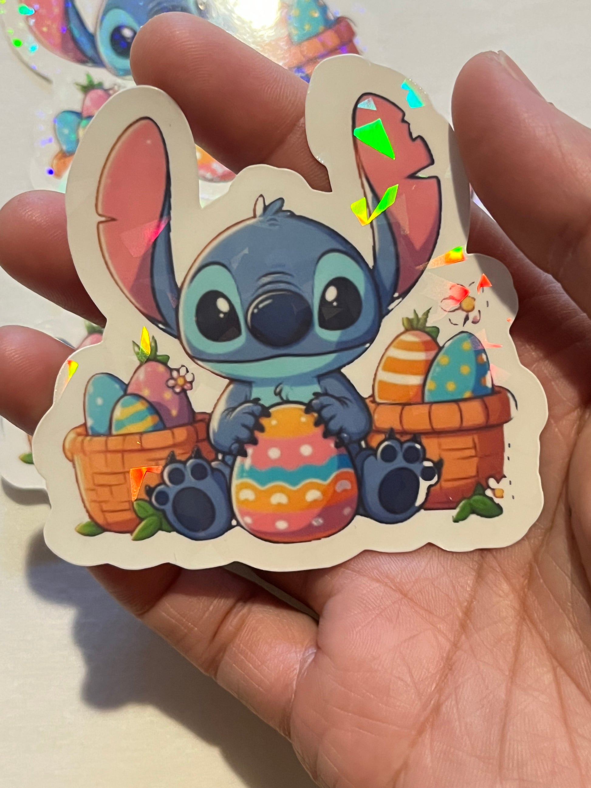 Stitch Easter Egg Sticker is printed on high-quality glossy weatherproof matte sticker paper covered with holographic laminating sheet!